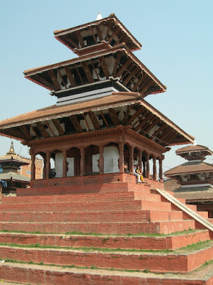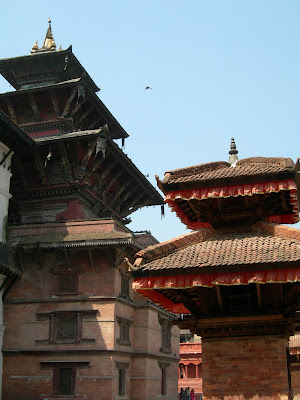 Nous avons passe plusieures heures a flaner dans la Durbar Square et a nous balader dans la vieille ville, admirant l'architecture newar qui caracterise les temples de la vallee : pagodes a plusieurs toits, faites de briques rouges et de bois. Certains temples sont meme construits avec le bois d'un seul arbre ! Au detour d'une ruelle, nous sommes egalement tombes sur une scene de culte hindou assez surprenante, le sacrifice d'un buffle en l'honneur de la deesse Kali. La tete du buffle avait ete coupee, et elle tronait aux pieds de l'effigie de Kali presente dans le temple, pendant que le buffle terminait de se vider de son sang sur le trottoir...
